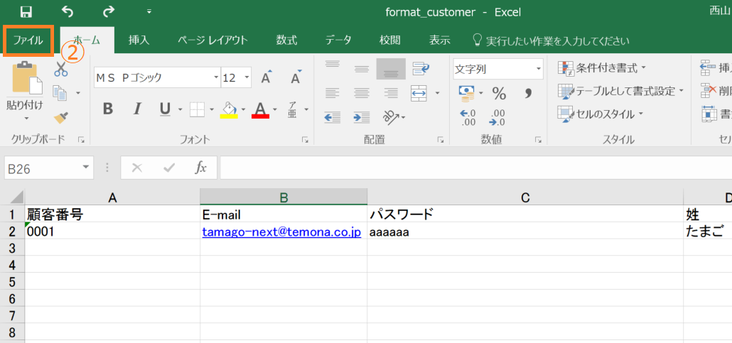 ②一括登録用ファイルに「E-mail」が入っている