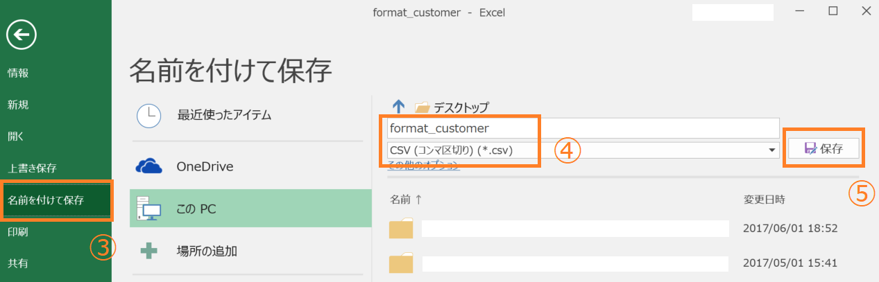 ④ファイル名を入力します。拡張子は「CSV」を指定します。