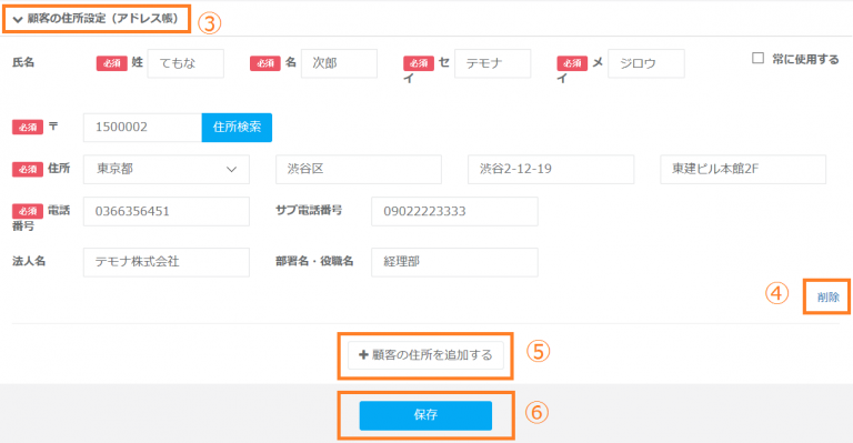 ⑤【顧客の住所設定(アドレス帳)】を追加したい場合は、「顧客の住所を追加する」ボタンをクリックします。