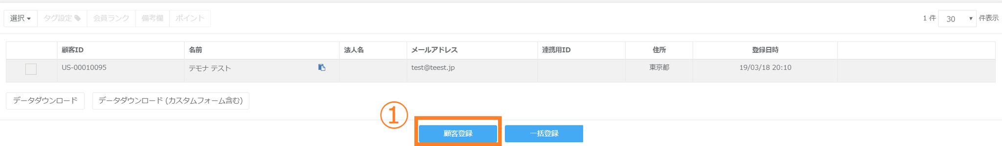 ①「顧客登録」ボタンをクリックします。