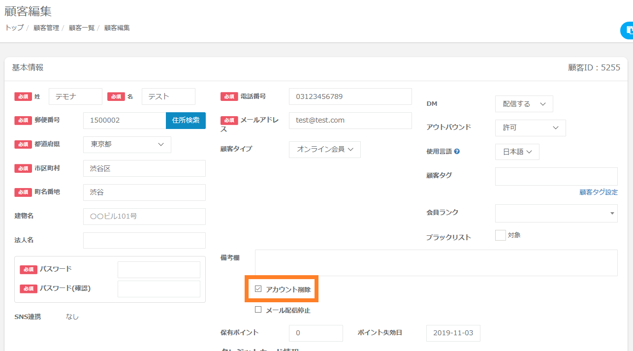 | アカウント削除 | 「アカウント削除」の有無が出力されます。0:アカウント削除なし1:アカウント削除あり | 0 |