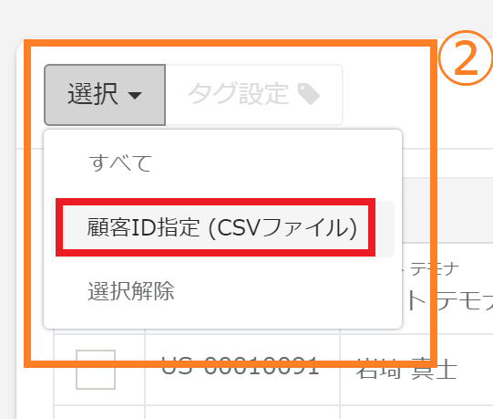 ②顧客一覧の選択ボタンをクリックいただき、「顧客ID指定(CSVファイル)」をご選択いただき、CSVファイルを取り込みます。