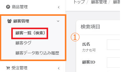 ①画面左のメニューバーより【顧客管理】>【顧客一覧(検索)】をクリックします