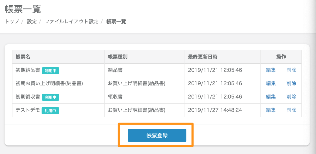 ②新規で作成したい場合は帳票登録をクリック、編集したい場合は帳票種別の編集をクリックします。