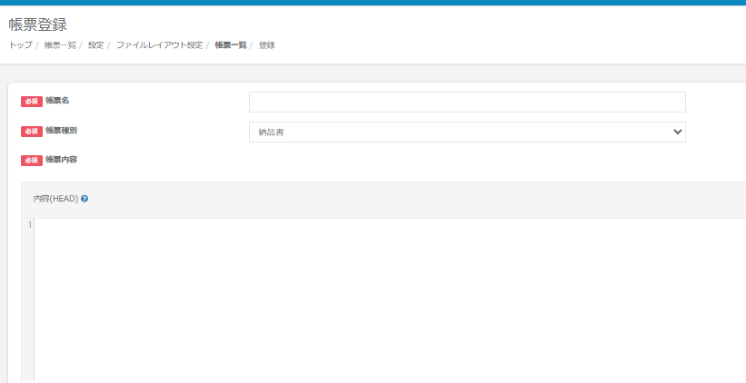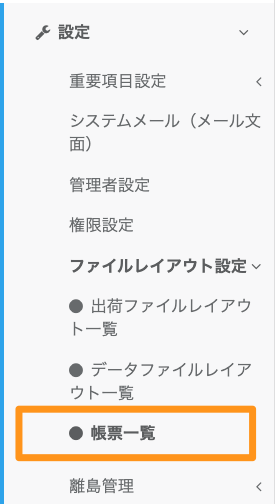 ①画面左のメニューバーより > 【設定】 > 【ファイルレイアウト設定】 > 【帳票一覧】をクリックします。