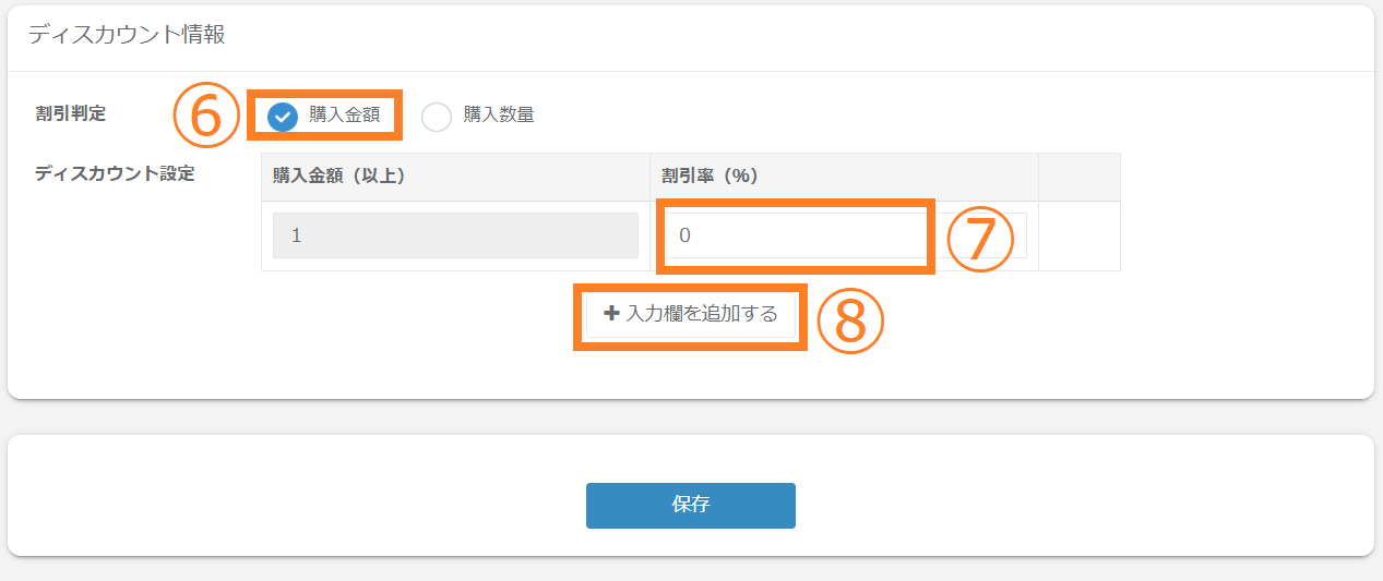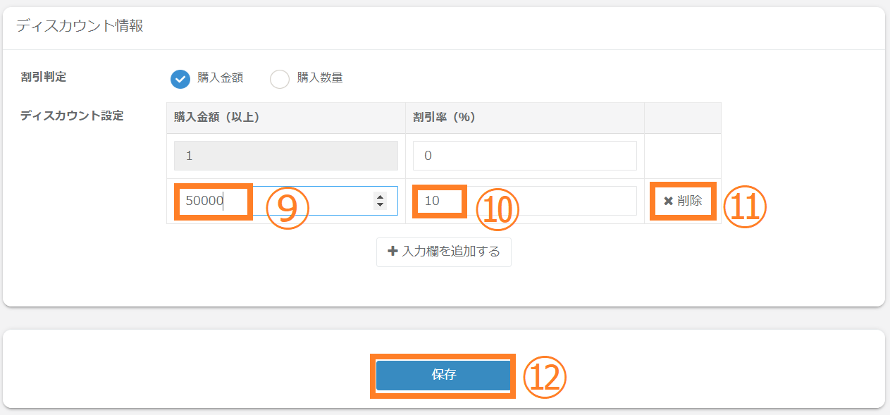 ⑧ディスカウントする購入金額を追加する場合は「入力欄を追加する」をクリックします。