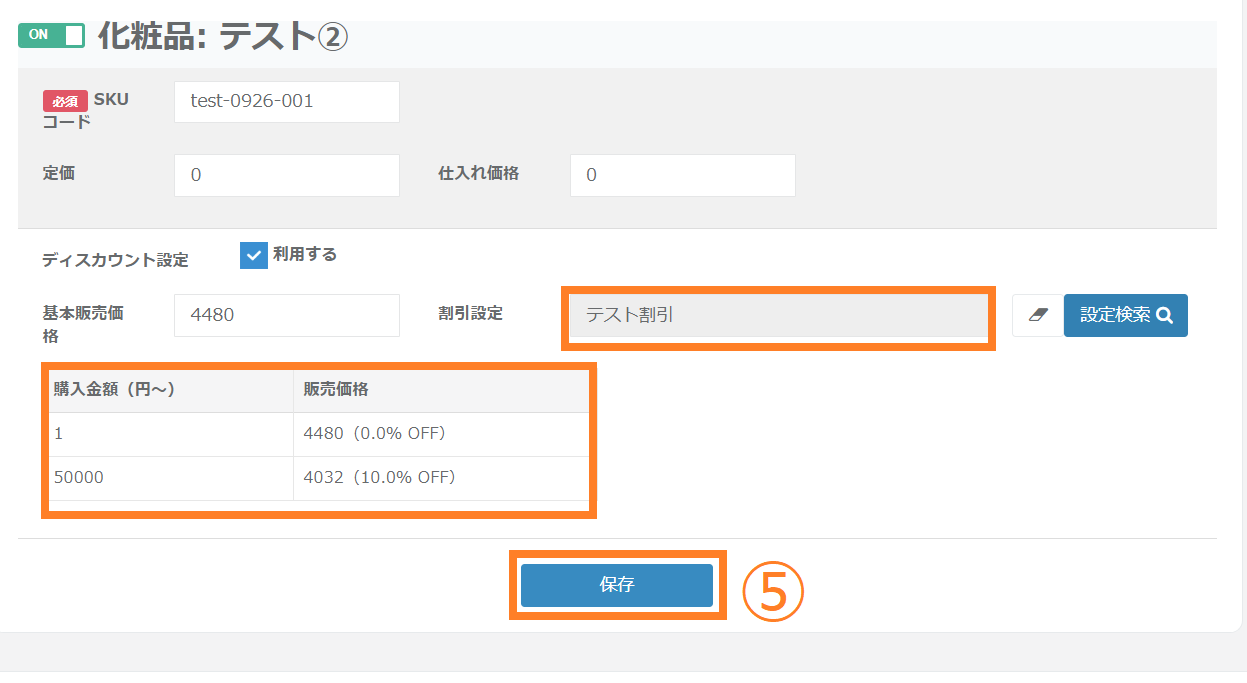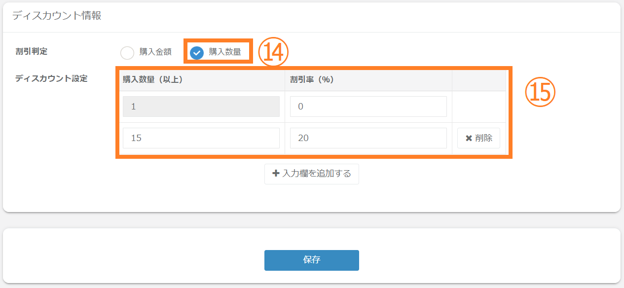 購入数量による割引きの場合は、割引きを反映させたい合計数量とそれに対しての割引率をご設定いただき、保存ください。