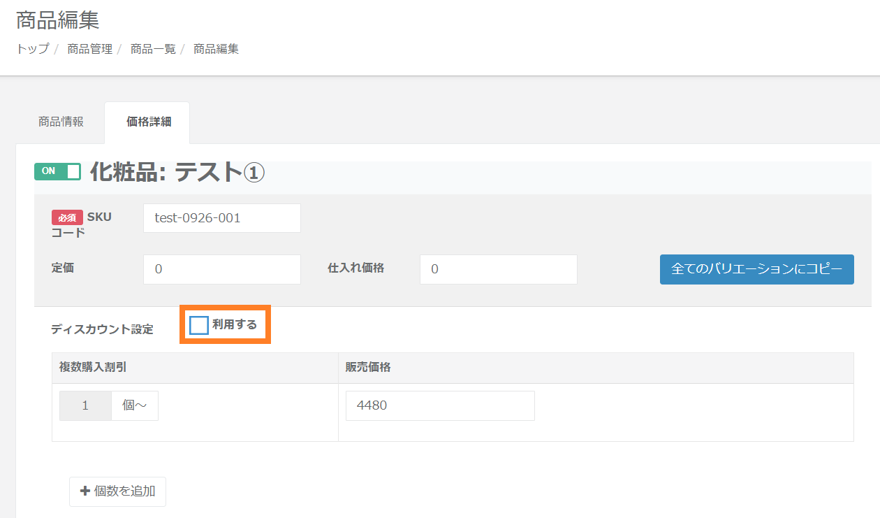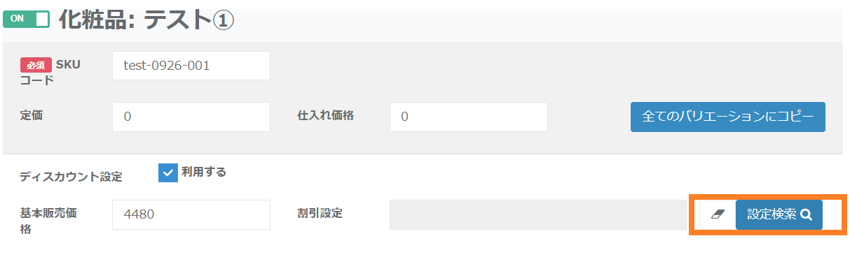 商品編集画面の価格詳細タブ>ディスカウント設定:「利用する」にチェックを入れていただくとボリュームディスカウントの「設定検索」ボタンが表示されます。