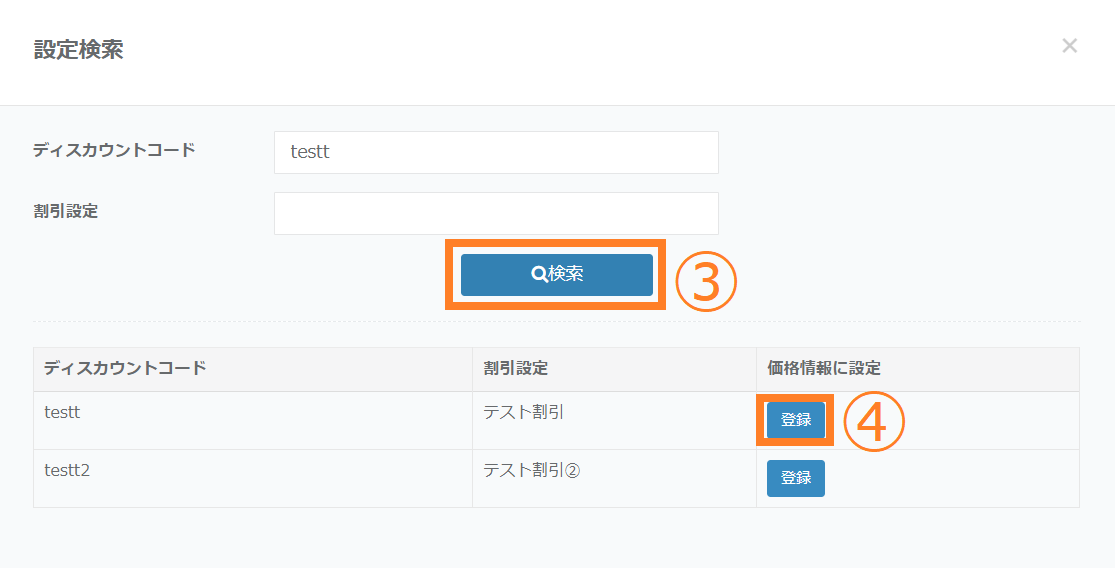 ③ディスカウントコードまたはディスカウント名で検索をかけます。