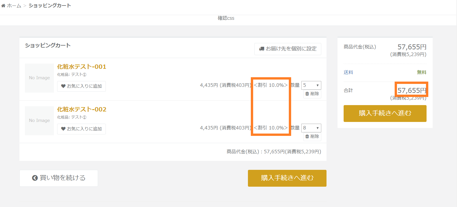 ※この際、10%の値引きが反映される商品は商品設定にてボリュームディスカウント設定がなされている商品に対してのみとなります。ボリュームディスカウント設定がされていない商品を一緒に購入された際は、その商品に対しては値引きが反映されません。