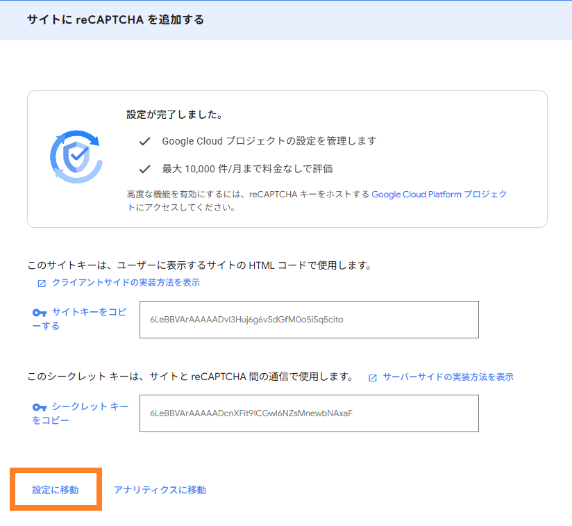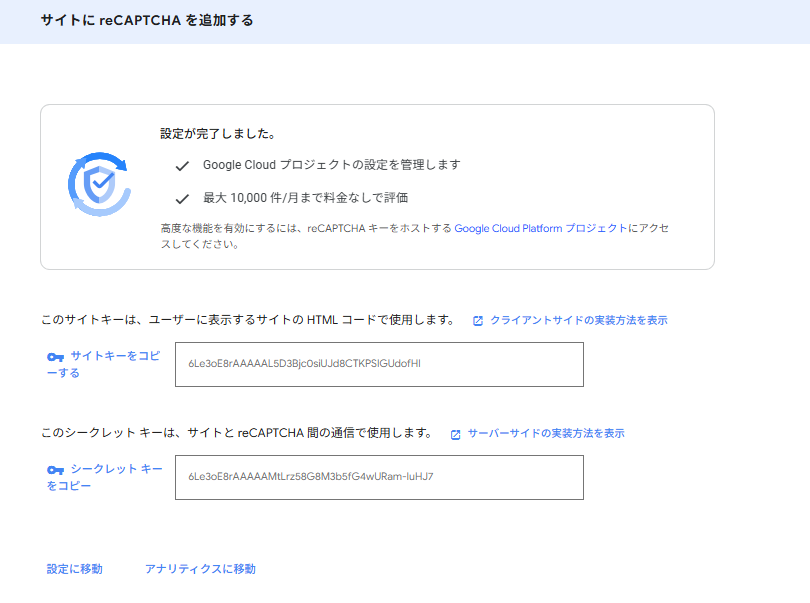 ⑤次のページで「サイトキー」と「シークレットキー」が発行されます。