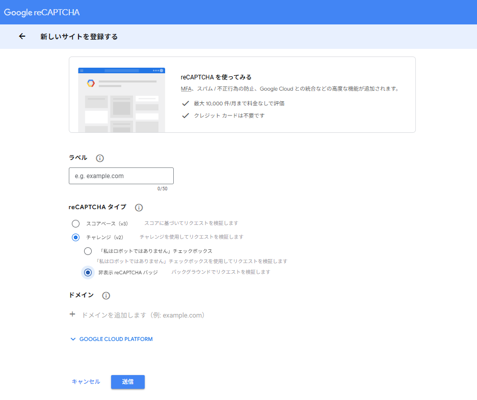- Google Cloud Platform:ご任意でご設定ください。設定しない場合でもGooglereCAPTCHAをご利用いただくことが可能です。
