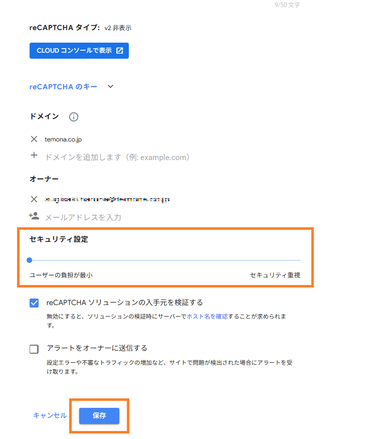 - ラベル:任意でご入力ください ※直接reCAPTCHA機能利用にあたって影響する項目でないため、お客様にてreCAPTCHA機能利用箇所を識別する内容等をご記入ください