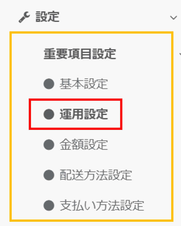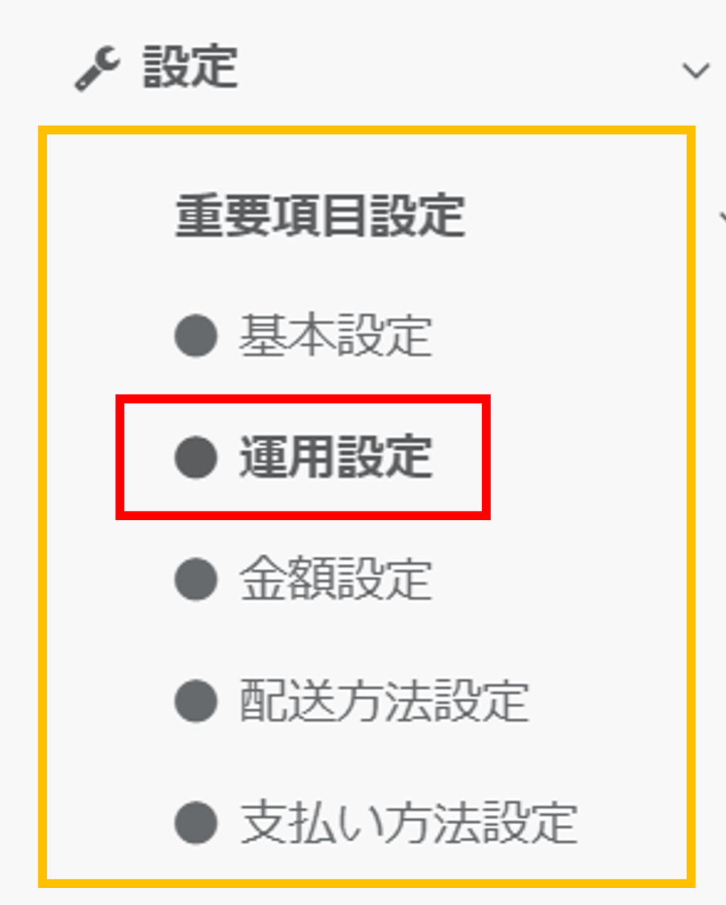 上記の場合には、サブスクストア管理画面 画面左のメニューバーより【設定】>【重要項目設定】>【運用設定】をクリックしてください。