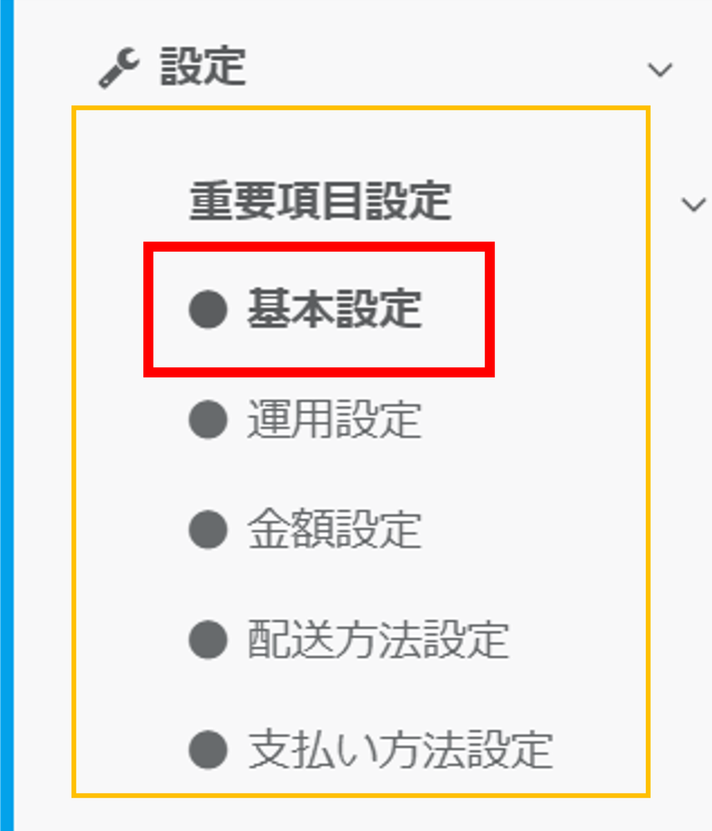 ①画面左のメニューバーより【設定】>【重要項目設定】>【基本設定】をクリックしてください。