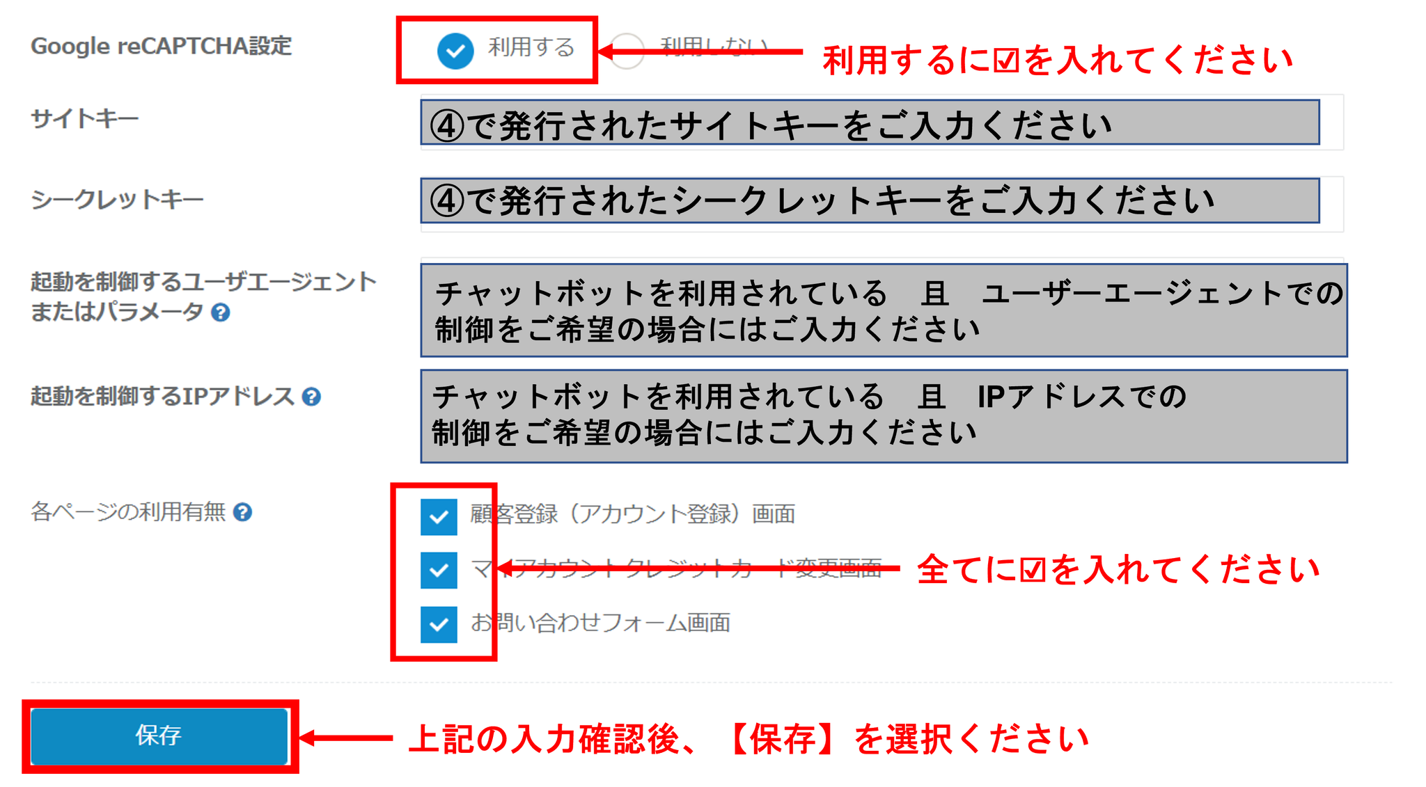 ②項目:Google reCaptcha設定 内の以下項目を登録してください