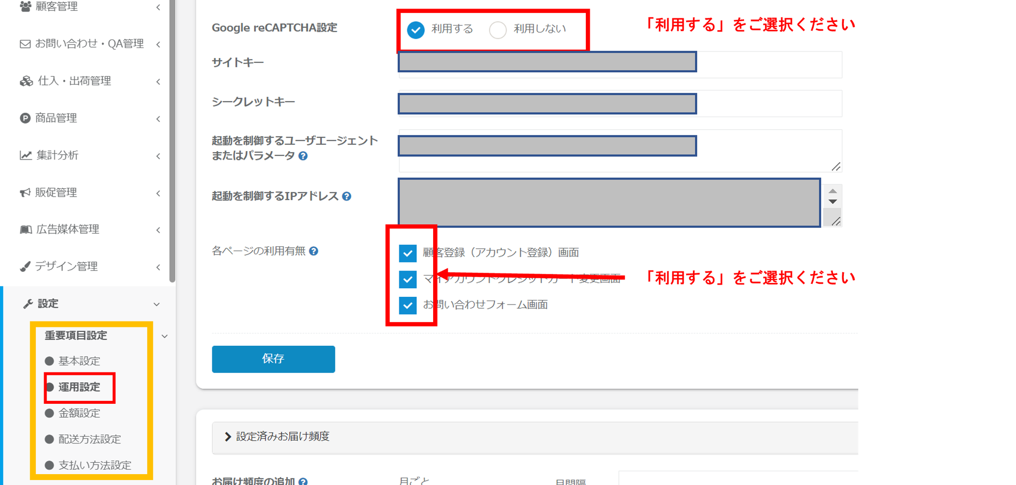 「Google reCAPTCHA設定」の利用がすべて「する」になっているのかご確認をお願い致します。