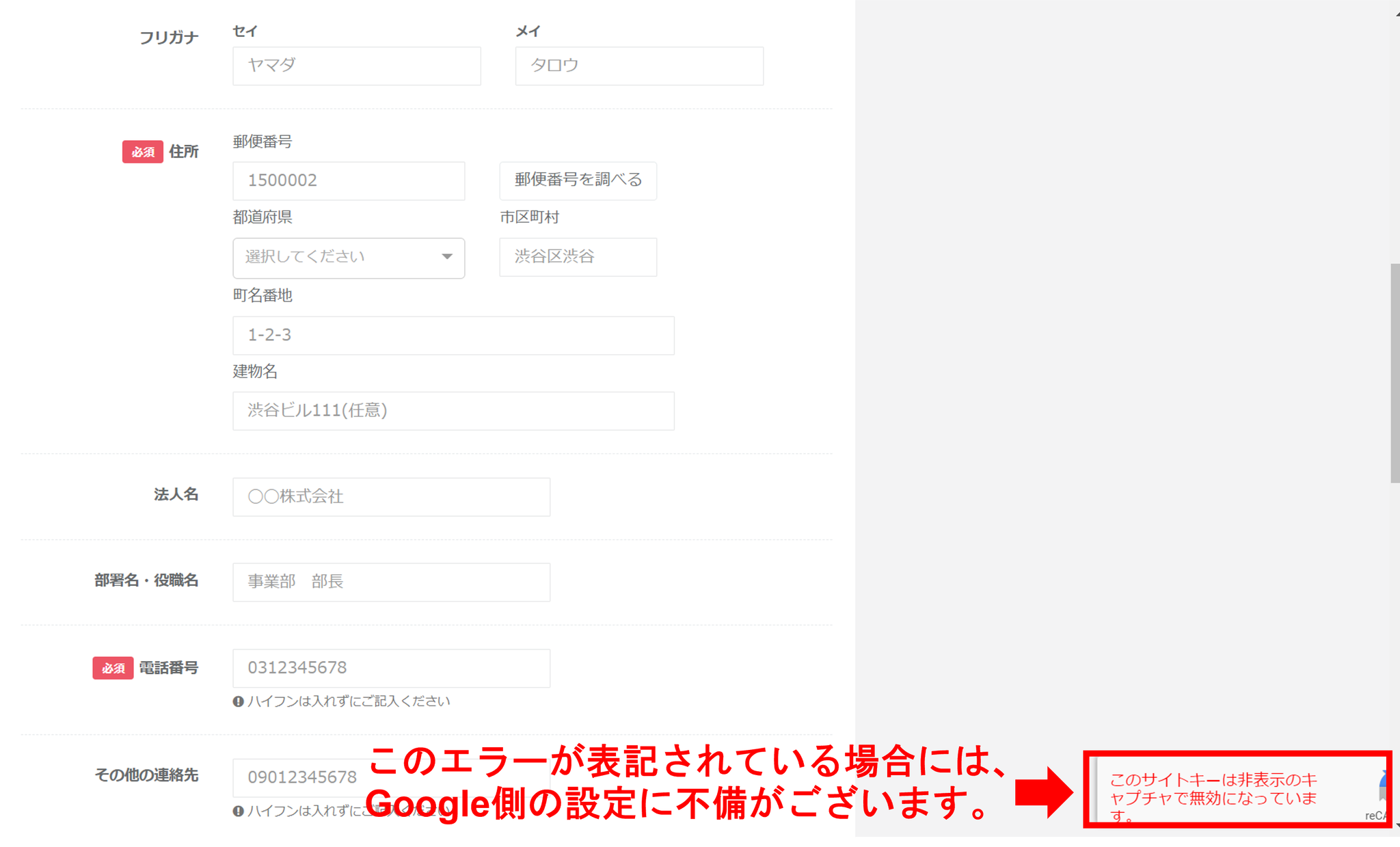 「購入者情報入力」画面右下の【reCAPTCHA】マークに赤文字でエラーが出力されます。