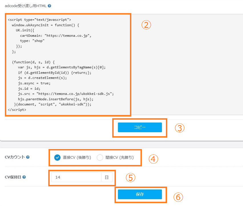 ⑤「CV保持日」お客様のブラウザで何日間CV情報を保持するかの設定となります。