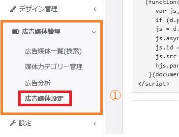 ①画面左のメニューバーより > 【広告媒体管理】 > 【広告媒体設定】をクリックしてください。
