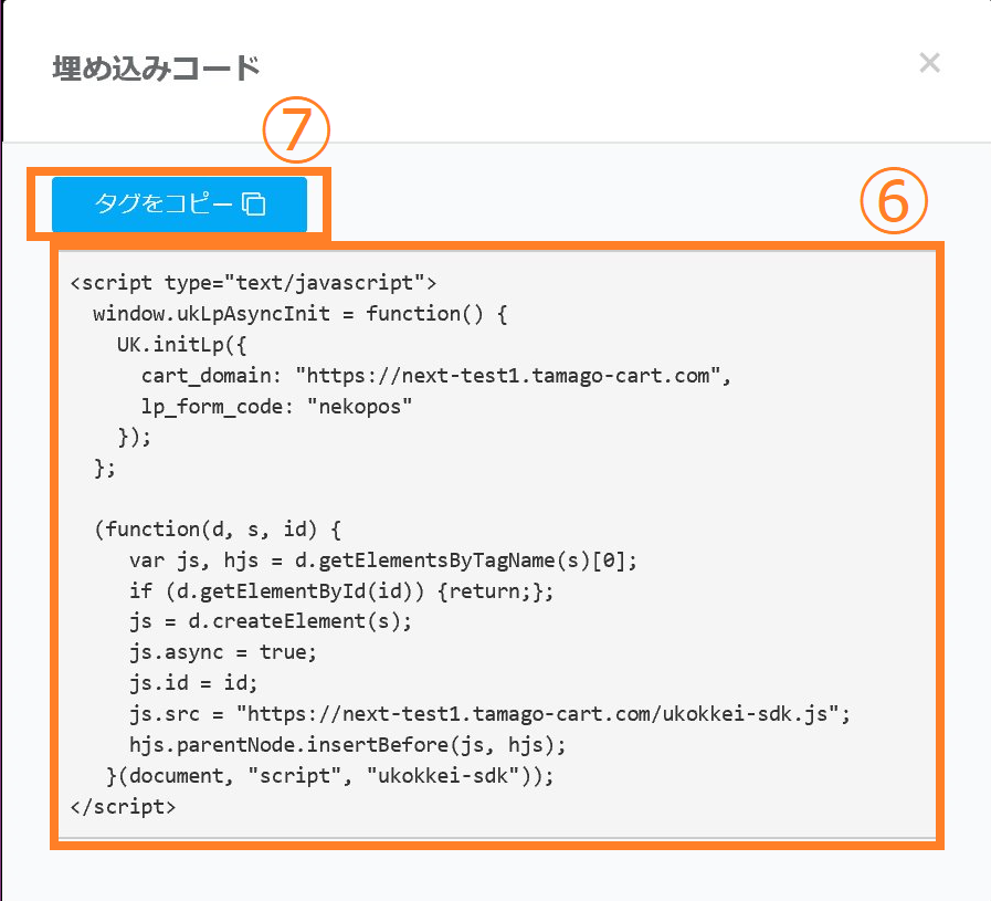 ⑦「タグをコピー」ボタンをクリックいただき、埋め込み先のLPのbodyの閉じタグ前に貼り付けてください。