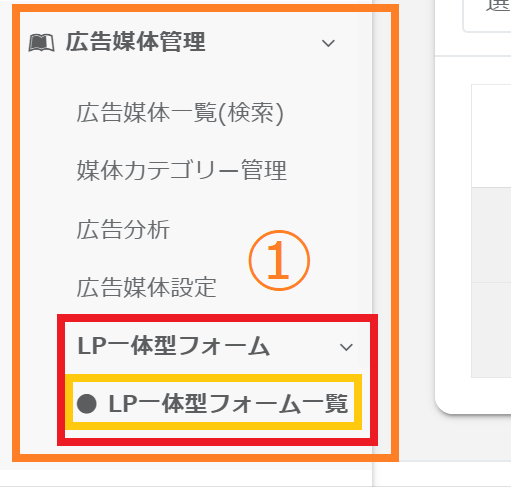 ①画面左のメニューバーより > 【広告媒体管理】 > 【LP一体型フォーム】 > 【LP一体型フォーム一覧】をクリックします。