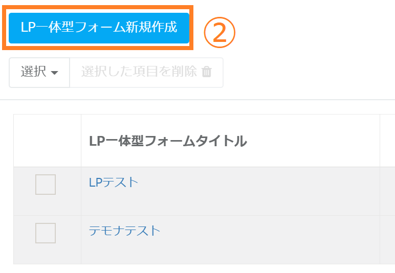 ①と同様に画面左のメニューバーより > 【LP一体型フォーム】 > 【LP一体型フォーム一覧】をクリックしてください。