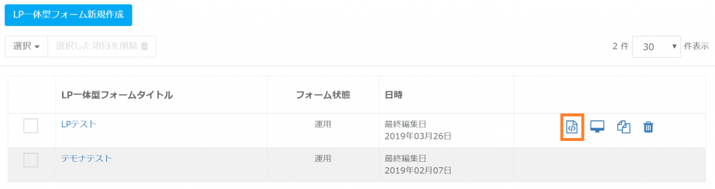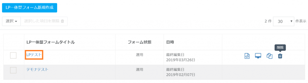 設定内容を編集したいLP一体型フォームの「LPタイトル」をクリックします。
