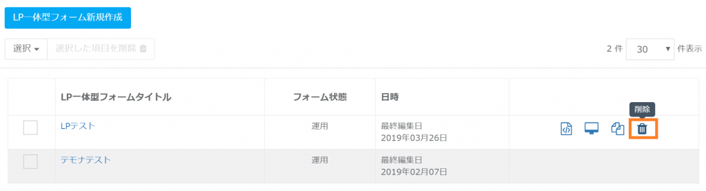 ※復元は不可ですのでご注意ください。LPフォーム上で注文が作成されている場合は削除出来ません。
