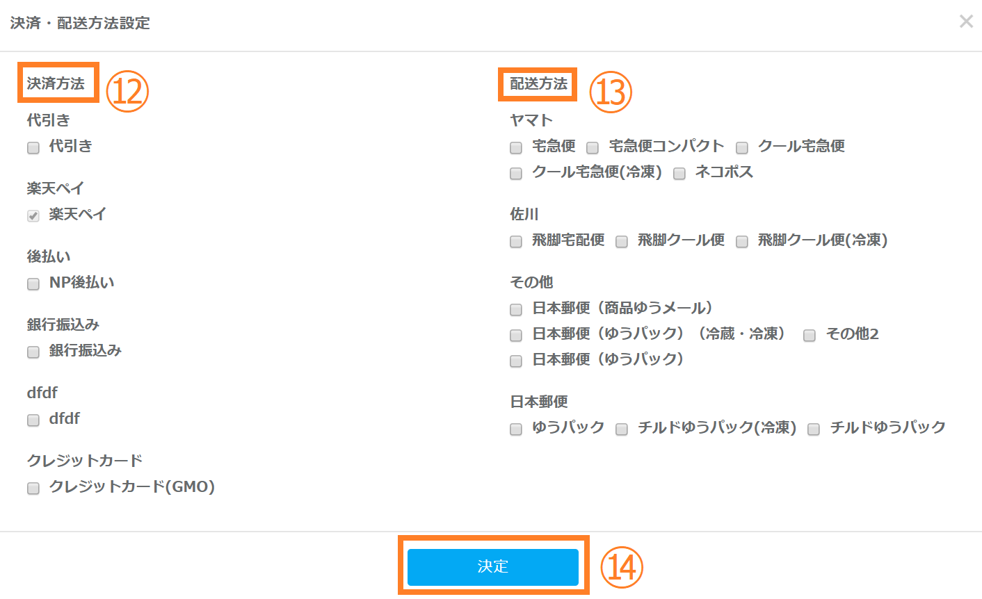 ⑫「決済方法」をご選択下さい。複数選択も可能です。