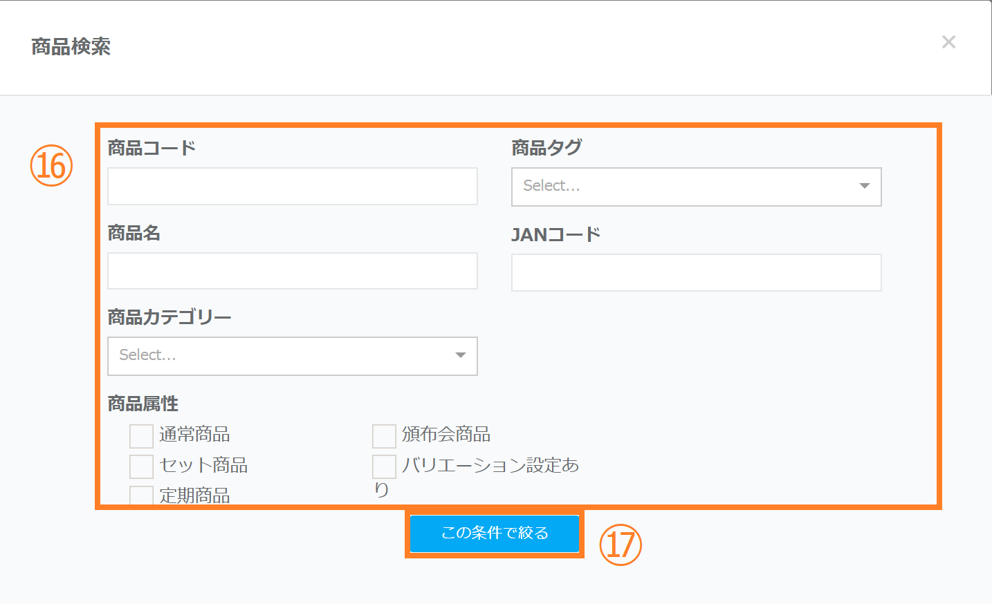 ⑯【商品管理】で登録いただいている商品を条件検索します。