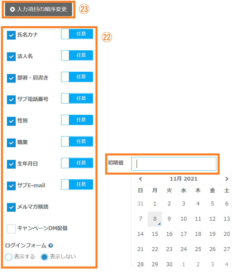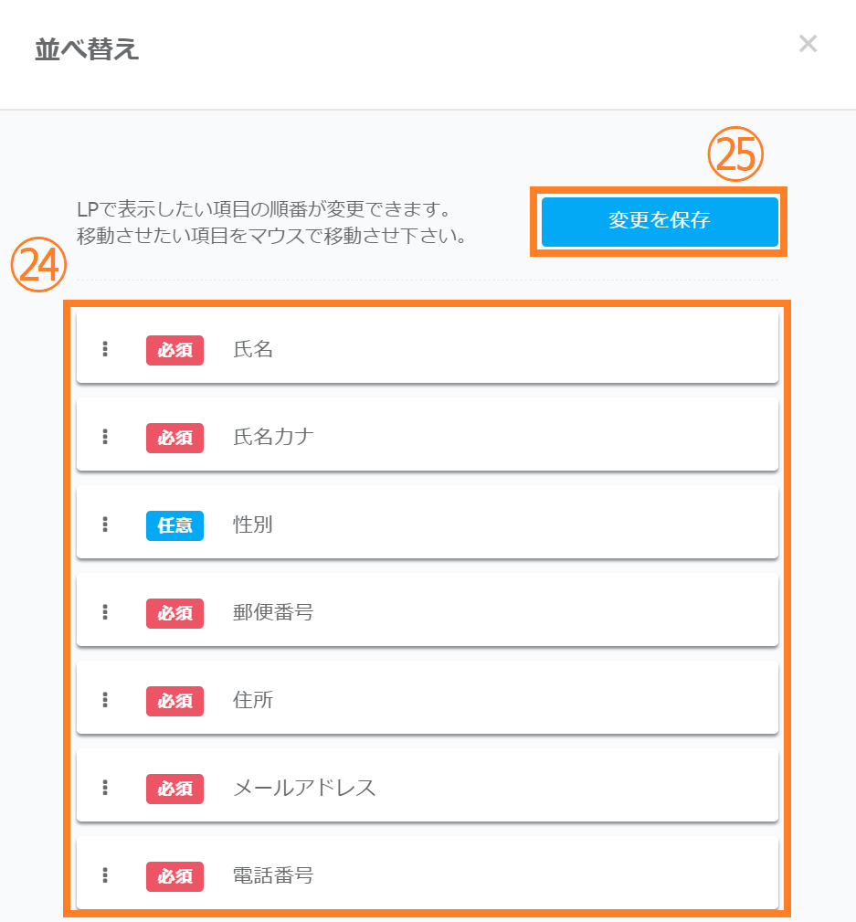 ㉓「入力項目の順序変更」をクリックするとフォームに並び順をご変更いただけます。