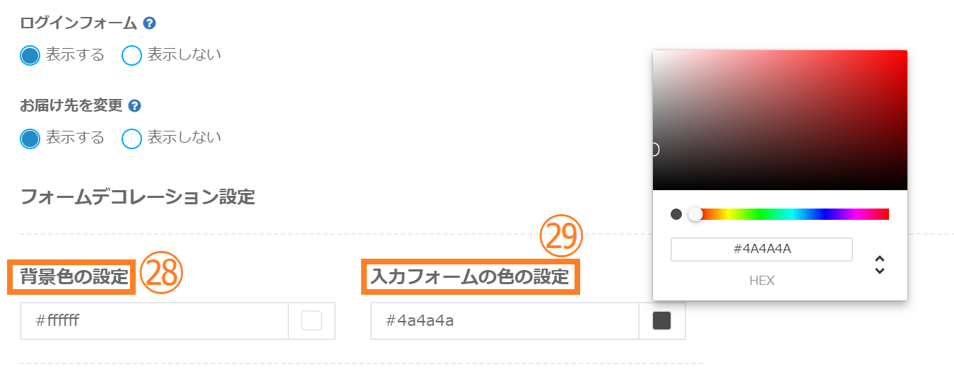 ㉙「入力フォームの色の設定」にて、フォーム部分の文字や枠線の色をご設定いただけます。