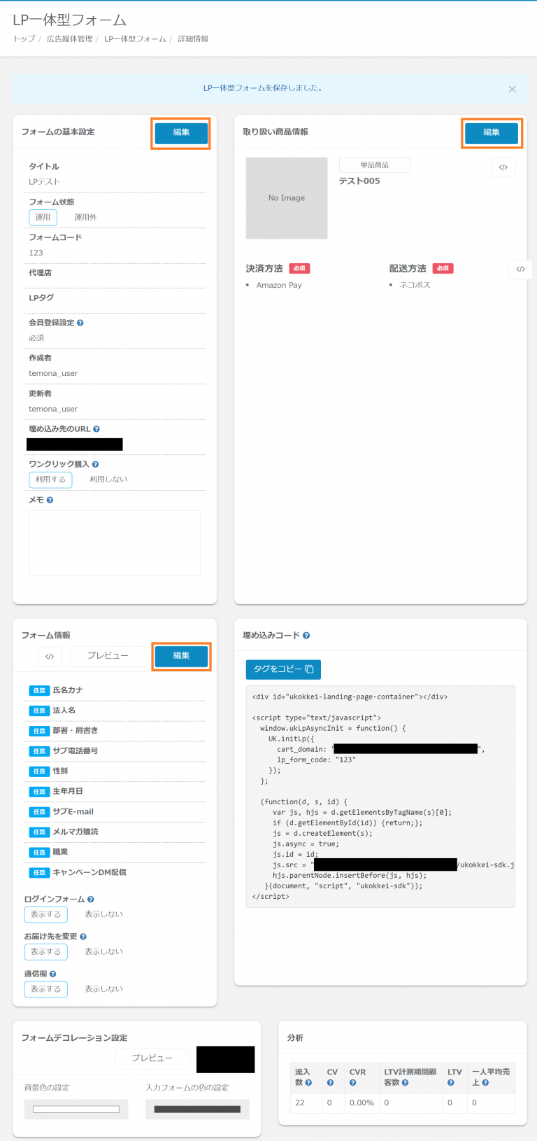 | 埋め込みコード | 広告媒体管理>LP一体型フォーム>LP一体型フォーム一覧>埋め込みコードが完全一致しているか |
