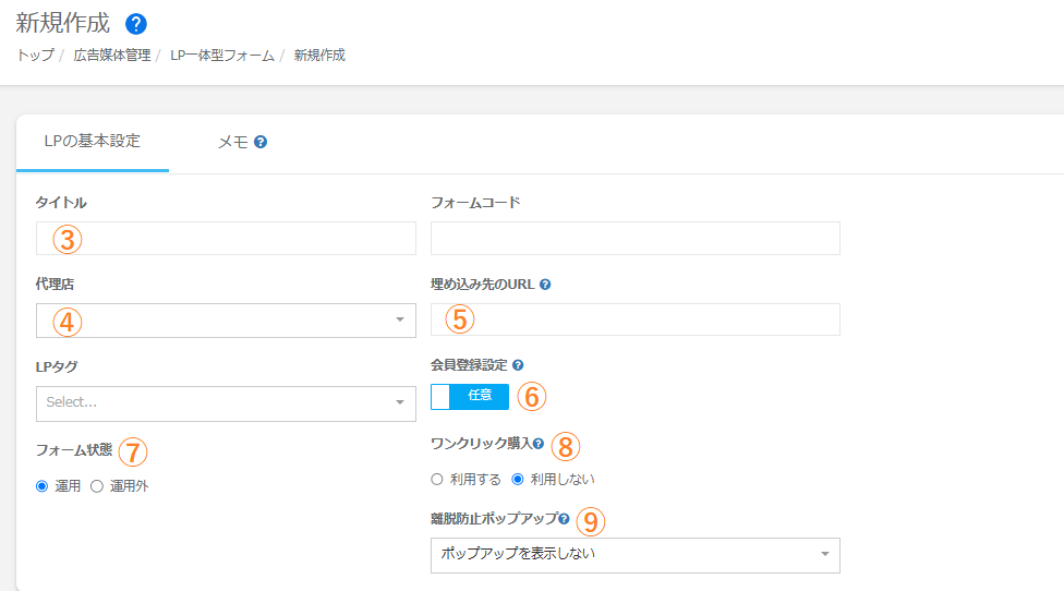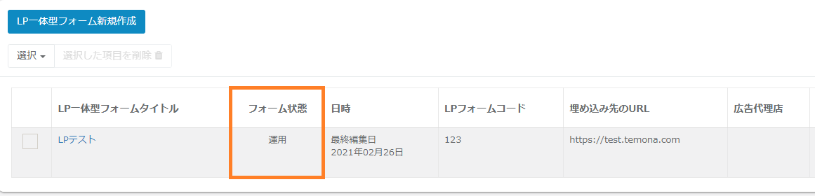 | フォーム状態 | 新規作成のLP基本設定で選択いただいたフォーム状態「運用」「運用外」が表示されます。 |