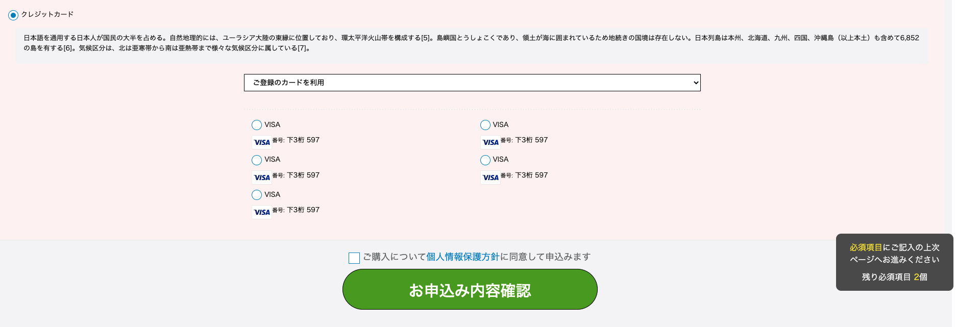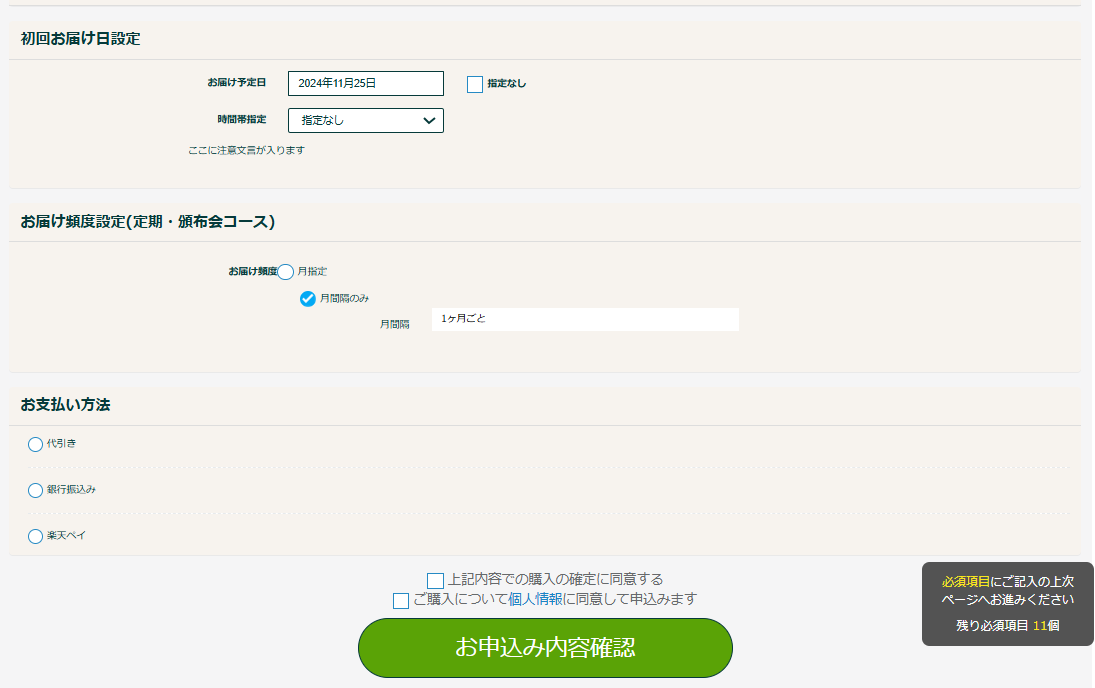⑨着日の指定から個人情報保護方針のチェックまでが完了すると「お申込み内容確認」ボタンをクリックして、ご注文情報確認画面に遷移することができます。