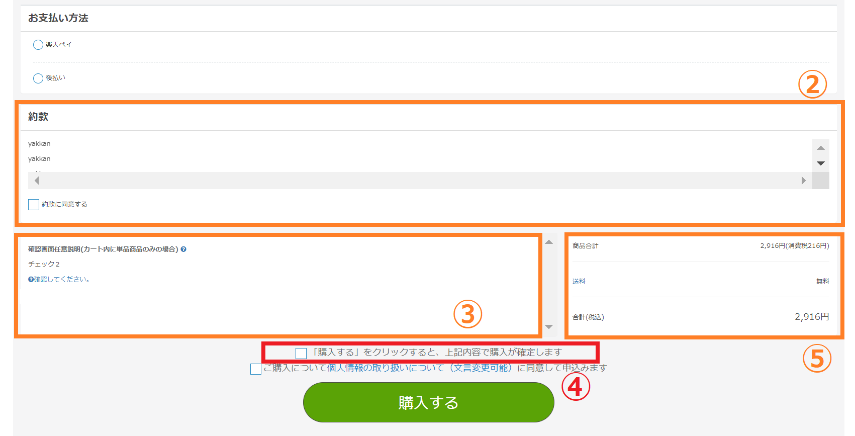 ②「 LPワンクリック購入利用時、LPに約款の表示」