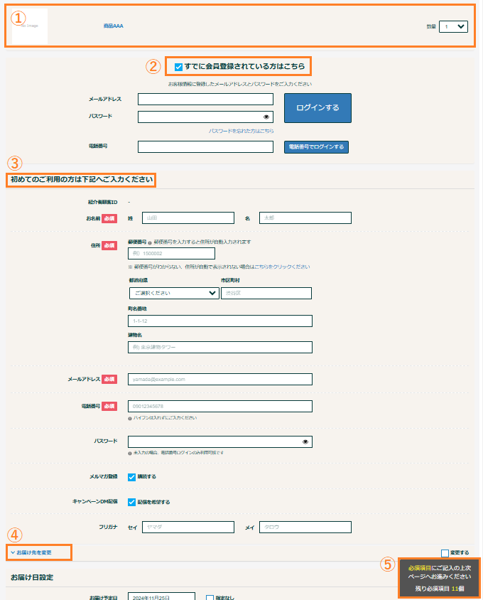 ④「お届け先を変更」する設定を可能にしている場合、フォーム下部に入力欄が追加されます。