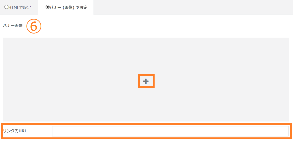 ⑥バナー(画像)を設定する場合、「+」マークのボタンをクリックしていただき、登録する画像を選択してください。続いて、http://を含めてリンク先URLをご設定ください。