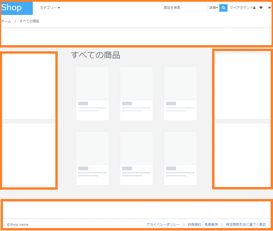 ①下記のようなヘッダーやフッター、左右サイドエリアの各ブロックを独自レイアウトに設定するためにブロック設定で各項目の作成と登録を行います。