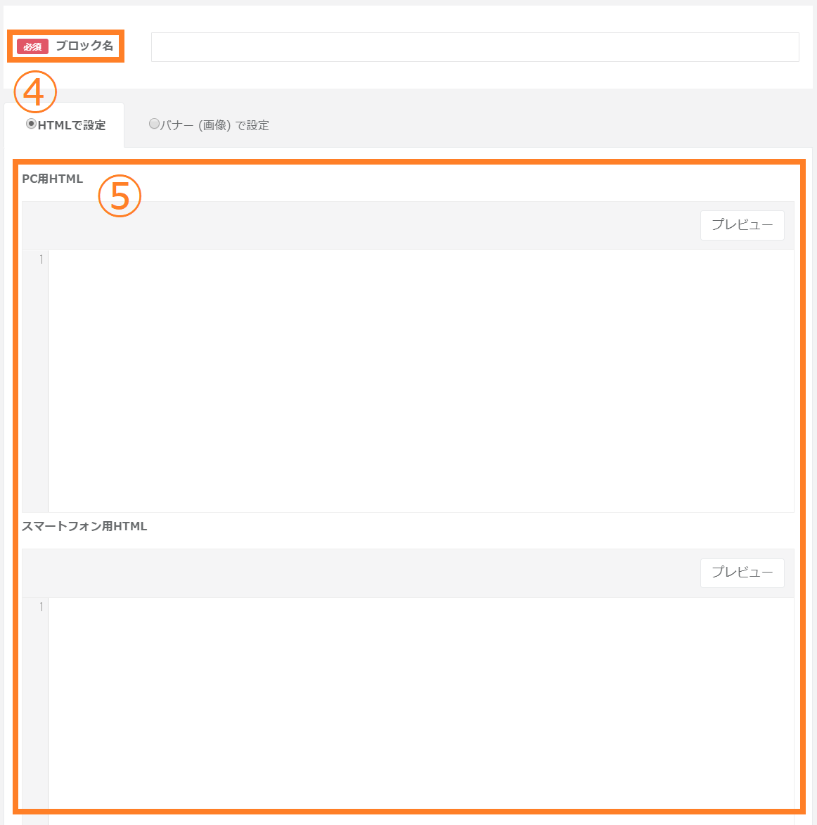 ⑤ブロックの内容はHTMLまたはバナー(画像)での設定が可能です。