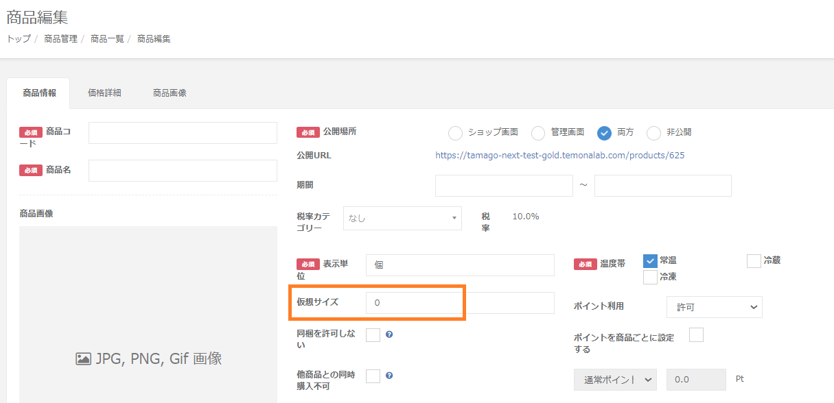 該当の商品の編集画面にて、商品ごとに任意の「仮想サイズ」をご入力ください。