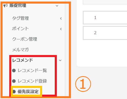 ①画面左のメニューバーより >【販促管理】>【レコメンド】>【優先度設定】をクリックしてください。