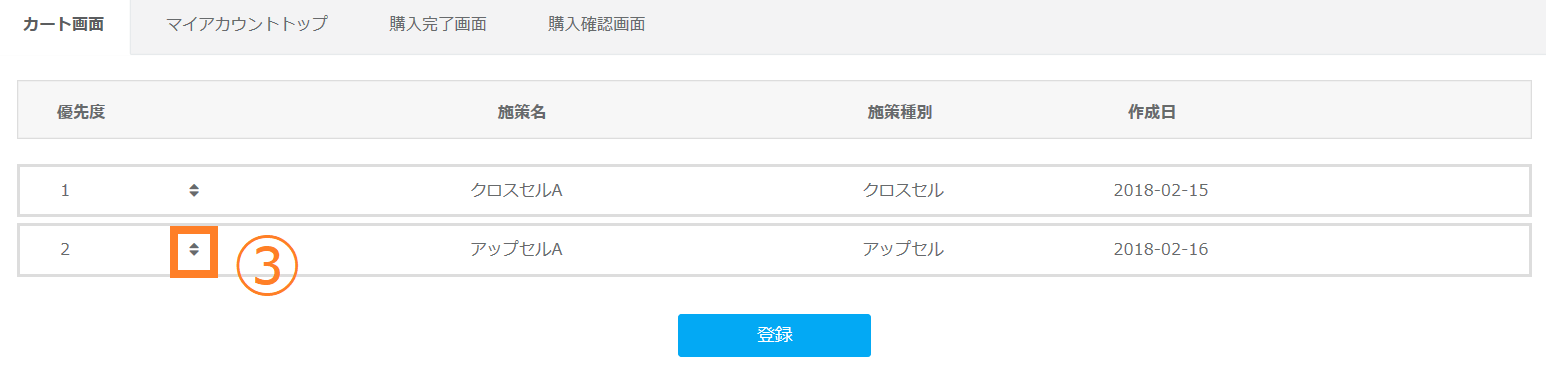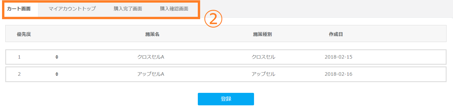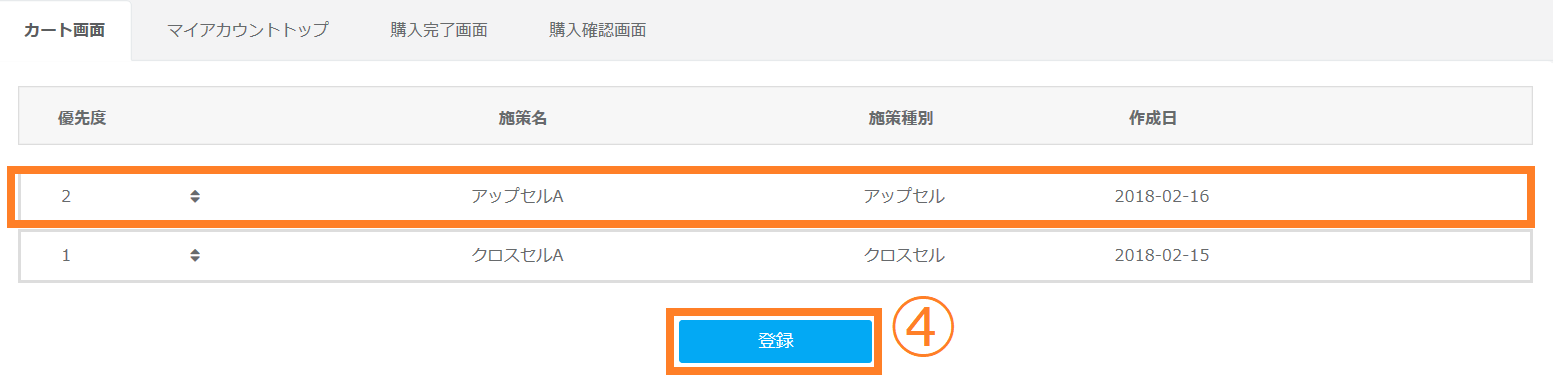 ②「カート画面」「マイアカウントトップ」「購入完了画面」「購入確認画面」の各画面で優先度を設定できます。