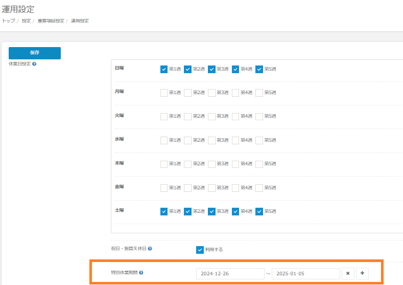 【設定】>【重要項目設定】>【運用設定】>【休業日設定】