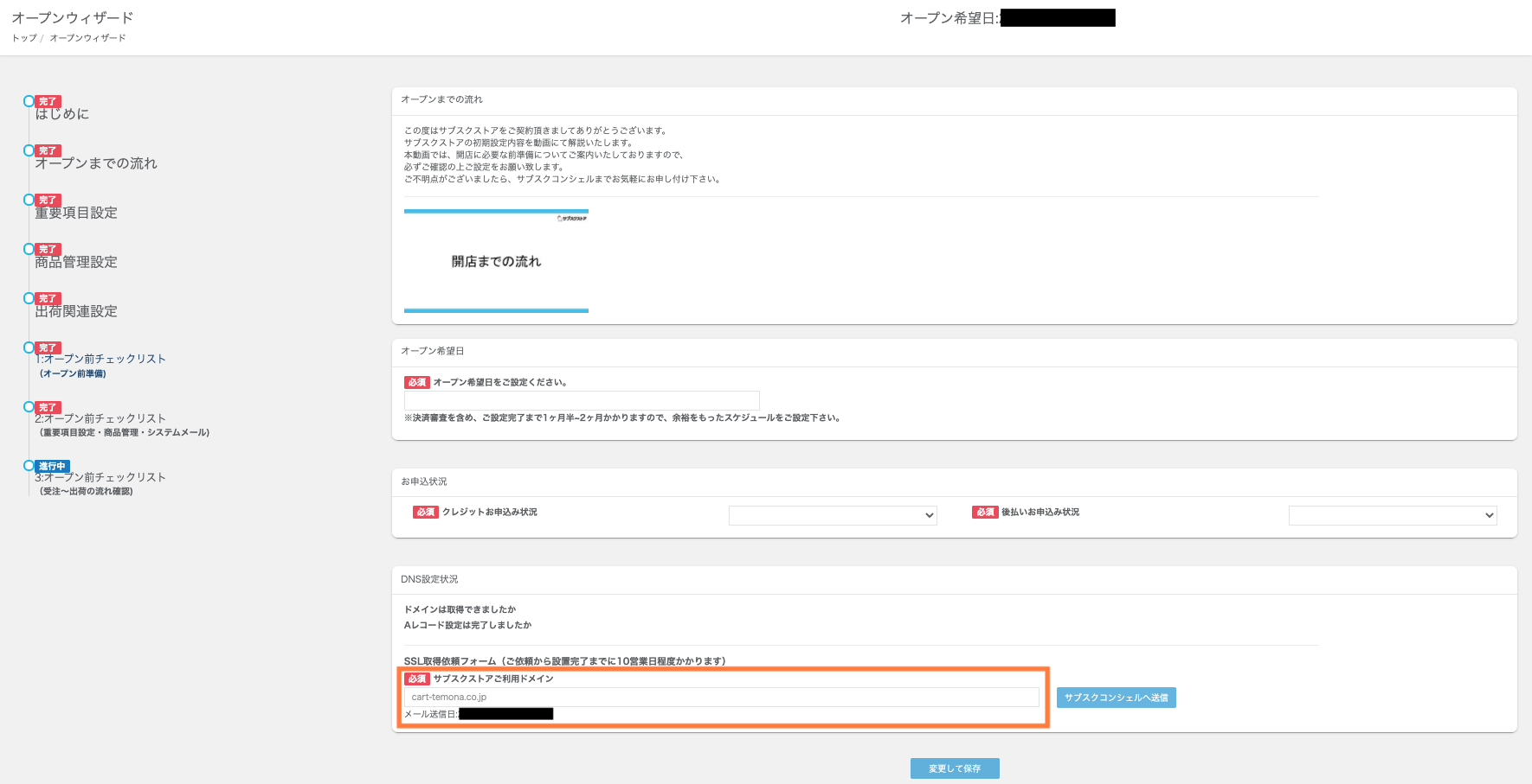 ドメインが確定、Aレコード設定が完了している場合は、管理画面【設定>オープンウィザード>オープンまでの流れ>DNS設定状況】のSSL取得依頼フォームより申請をお願いいたします。