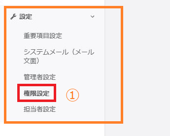 ①画面左のメニューバーより > 【設定】 > 【権限設定】をクリックしてください。