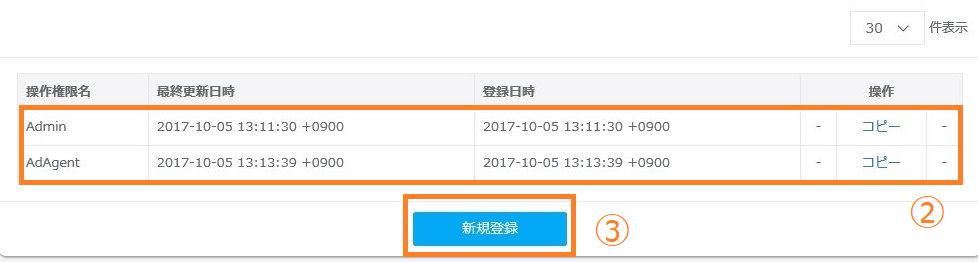 ②デフォルトで登録されている「Admin」は全ての画面をご利用できる権限となり、「AdAgent」は広告媒体管理の一部のみご利用できる権限となります。