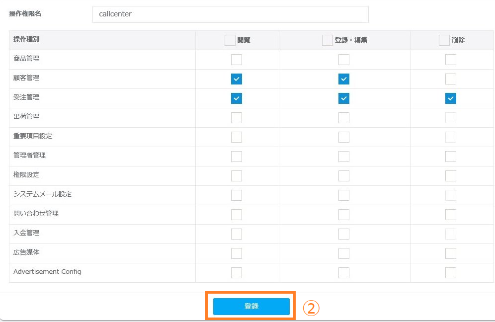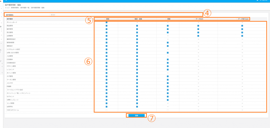 ⑤「閲覧」は対象画面を確認する権限、「登録・編集」は対象画面で登録・編集する権限、「削除」は対象画面で削除する権限、「データ出力」は対象画面でデータをダウンロードする権限、「データ取り込み」では対象画面でデータをインポートできる権限を設定できます。