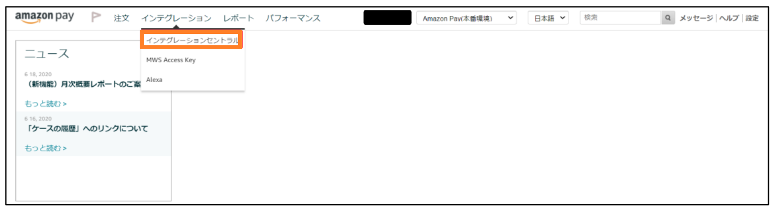 ①AmazonPayセラーセントラルにログインし、【インテグレーション】> メニューバー【インテグレーションセントラル】>「 アプリケーションを確認する」をご選択ください。
